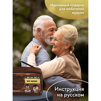 Радиоприемник MIRU SR-1027 коричневого цвета имеет ретро дизайн, простой функционал и обеспечивает приём сигналов в диапазоне FM, AM и SW. Аналоговый способ настройки частоты предполагает более точное и быстрое улавливание нужного канала. Для улучшения качества сигнала у радиоприемника имеется поворотная телескопическая антенна. Радиоприемник SR-1027 может работать как от сети 220В и аккумулятора, так и от двух батареек типа R20(D). Органы регулировки громкость и смена диапазонов расположены на передней панели приемника. Также предусмотрено проигрывание с USB и microSD накопителей. Данный радиоприемник отлично подойдет для туристов, дачников и просто любителей отдыха на природе.